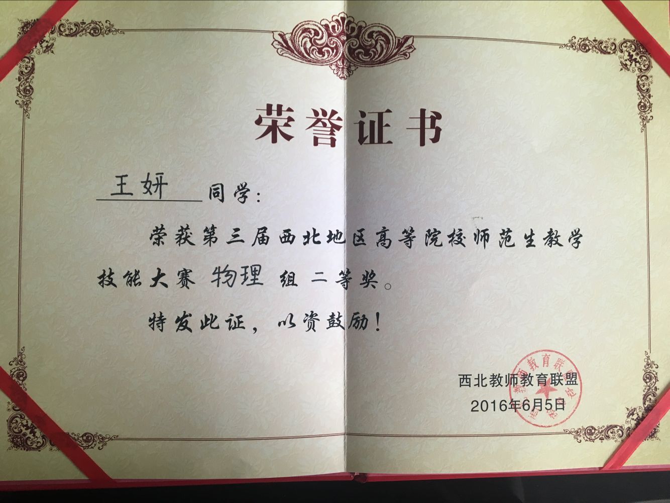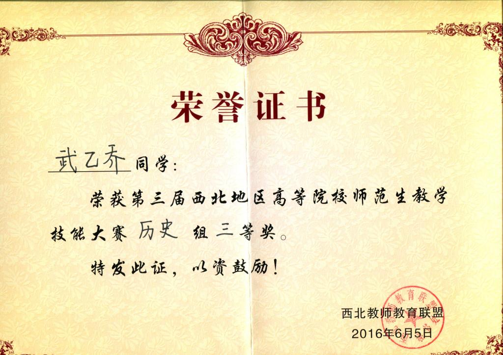 6月3日—5日,第三届西北地区高等院校师范生教学技能大赛在陕西师范大学举行。我校选派的3名选手在本次大赛上荣获佳绩,其中化学化工学院学生仝蒙蒙荣获化学学科二等奖(指导教师:韩银凤),物理与光电技术学院学生王妍获物理学科二等奖(指导教师:沈亦红),历史文化与旅游系学生武乙乔获历史学科三等奖(指导教师:王岁孝)。