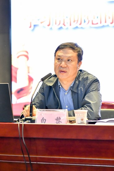 白黎在讲话中指出,学校举办学习贯彻党的十九大精神培训班的目的是进一步增强学校处科级干部学习贯彻习近平新时代中国特色社会主义思想的自觉性和坚定性,用习近平新时代中国特色社会主义思想武装头脑、引领方向、指导实践,努力开创学校改革建设发展的新局面。他强调,全校处科级干部要提高政治站位、增强“四个意识”、高度重视培训,充分认识学习贯彻十九大精神的重大意义;要珍惜机会,以积极的态度、饱满的热情参加培训,圆满完成培训任务;要理清理论学习与实践的关系,学深学透、学有所获,用十九大精神推动学校创建高水平大学各项工作;要遵守纪律,按时听课,做好笔记,参加好讨论,撰写好心得,确保高质量完成培训任务。他要求,参加培训人员要以学促干、以干促学,以更加奋发有为的精神状态投身到学校改革发展全过程,使学校各项工作持续迈上新台阶。