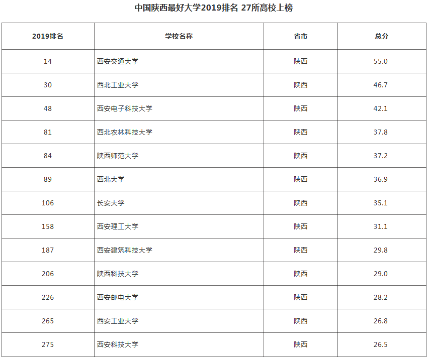 1月23日,世界大学学术排名(ARWU)最新发布2019“中国最好大学排名”,除我国台港澳地区之外综合实力最强的549所大学上榜,清华大学、北京大学、浙江大学位列前三。其中陕西共有27所高校上榜,西安交通大学排名全国第14陕西第1名,西北工业大学全国第30陕西第2名,我校全国排名343名,陕西第18名。