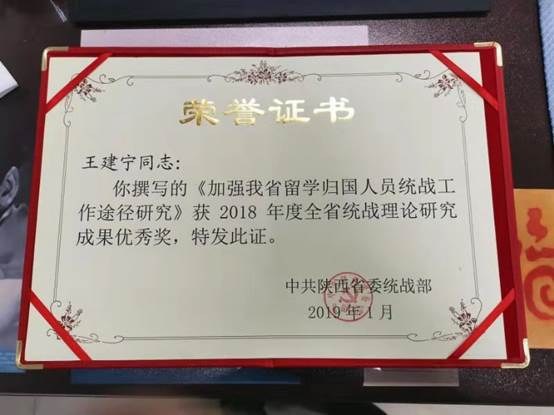 在2月2日召开的全省统战部长会议上,我校民盟盟员、外国语学院副教授王建宁撰写的《加强我省留学归国人员统战工作途径研究》一文,获全省“统战理论研究”优秀奖。(党委统战部 文、图/王红梅)