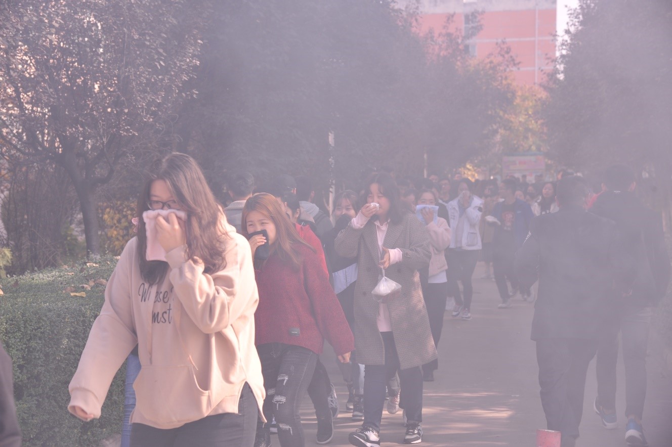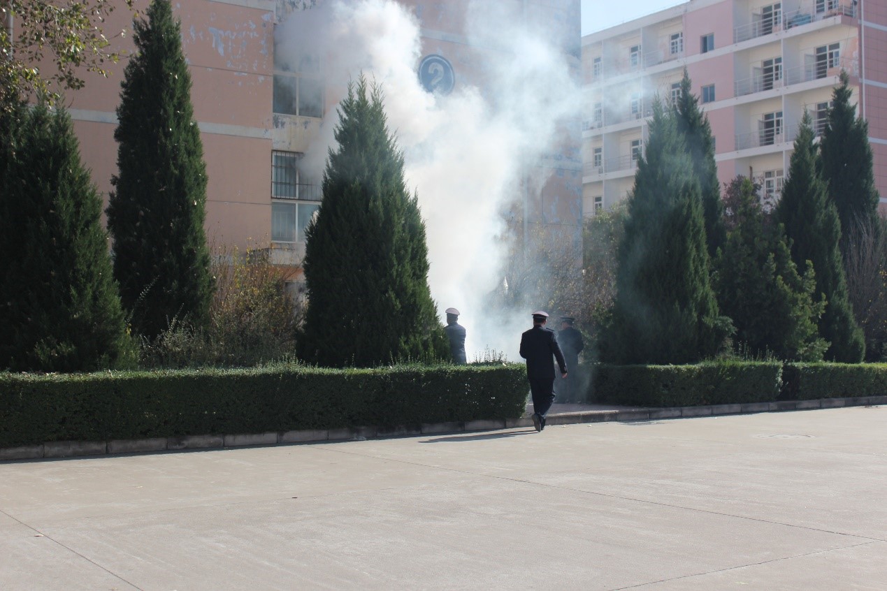 上午11时50分,消防灭火及应急疏散演练正式开始,2号学生公寓二楼、三楼浓烟滚滚,学校义务消防员首先到达火场,进行初期火灾扑救,同时报警中心及时拨打“119”消防报警电话报警。