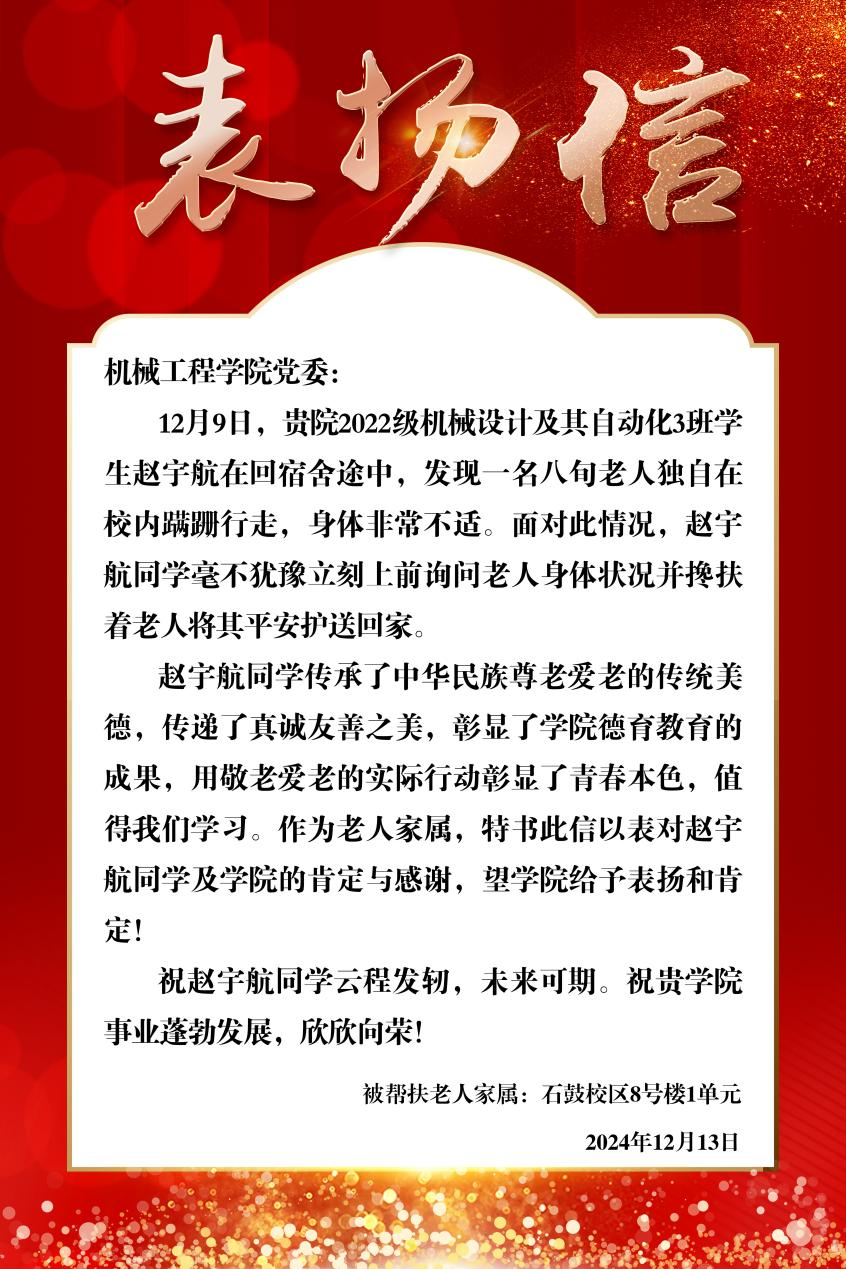 近日,机械工程学院收到了一封表扬信,信中受助老人家属对2022级机械设计及其自动化3班赵宇航同学尊老爱老,帮助突发身体不适老人的良好品德给予了表扬。