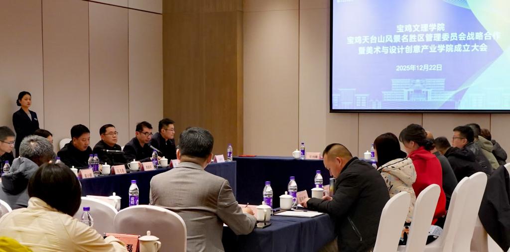 12月22日下午,我校与宝鸡天台山风景名胜区管理委员会战略合作暨美术与设计创意产业学院成立大会在如意茵香茂御酒店举行。副校长冯飞龙出席会议并讲话。会议由美术与设计学院副院长马箖珺主持。