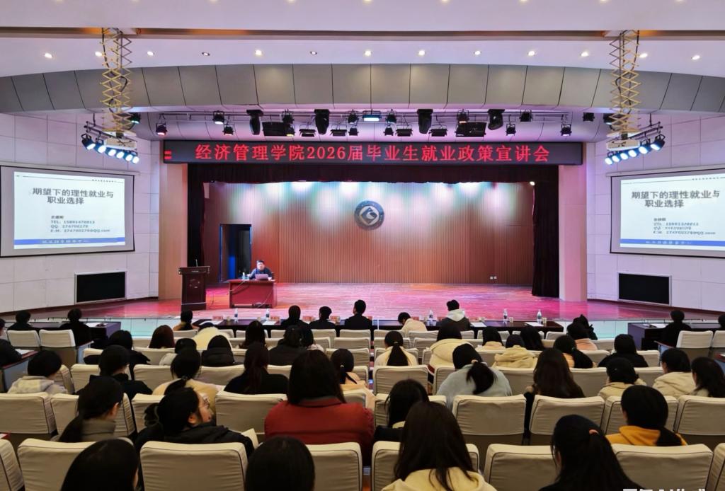 3月13日上午,经济管理学院在高新校区音乐厅召开2026届毕业生就业政策宣讲会。会议由学院党委副书记于媛主持。