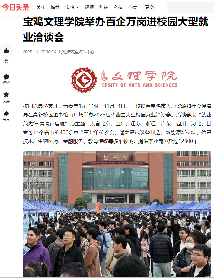 近日,学校开展“到延安去”·三秦学子圣地行教育活动、大学生社会实践基地在红光沟航天精神文化区揭牌、校友王佳佳为山区学生教授街舞受到广泛关注与赞誉、学校举办百企万岗进校园大型就业洽谈会、3个基层党组织入选第五批新时代陕西高校党建“双创”工作培育创建单位、与陈仓区人民检察院启动“检校合作与服务项目”、与宝鸡市生态环境局签署战略合作协议、纪念抗战胜利80周年舞台美术作品展在我校开幕、学校举行“AI视域下陕西当代文学研究高层论坛暨年度工作会议”等活动引起中央电视台、学习强国、西部法治报、西北在线、阳光网、陕西农村网、中华网、西铁宝鸡东站、今日头条等多家媒体广泛关注和报道。