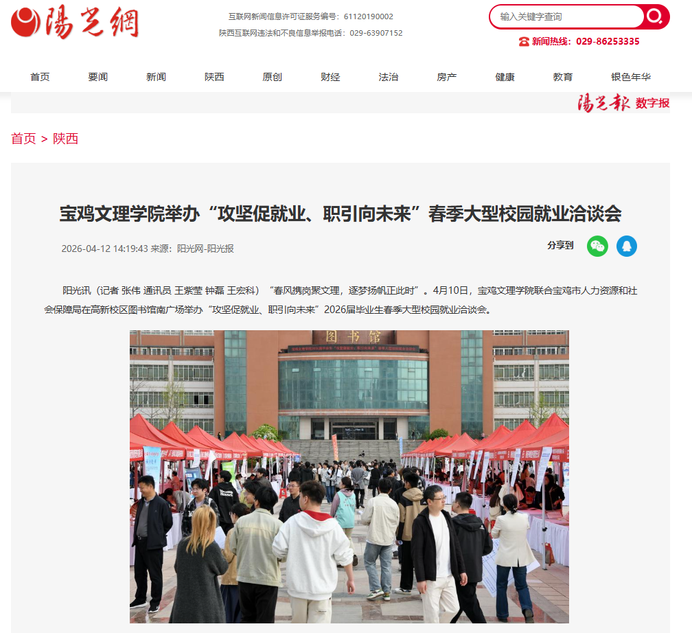 近日,我校举办树立和践行正确政绩观学习教育读书班暨党委理论学习中心组(扩大)学习会、举办春季大型校园就业洽谈会、启动2026年“典耀中华书香文理”主题读书活动、举办核心素养导向下中学语文读写教学创新实践与教师专业发展研讨会、图书馆赵钊博士团队荣获省档案优秀科技成果三等奖、校园春日美景等引起西北在线、西北信息报、陕西农村网、阳光网、起点新闻、宝鸡二三里、宝鸡融媒体中心、中华网、今日头条、百度等多家媒体广泛关注和报道。