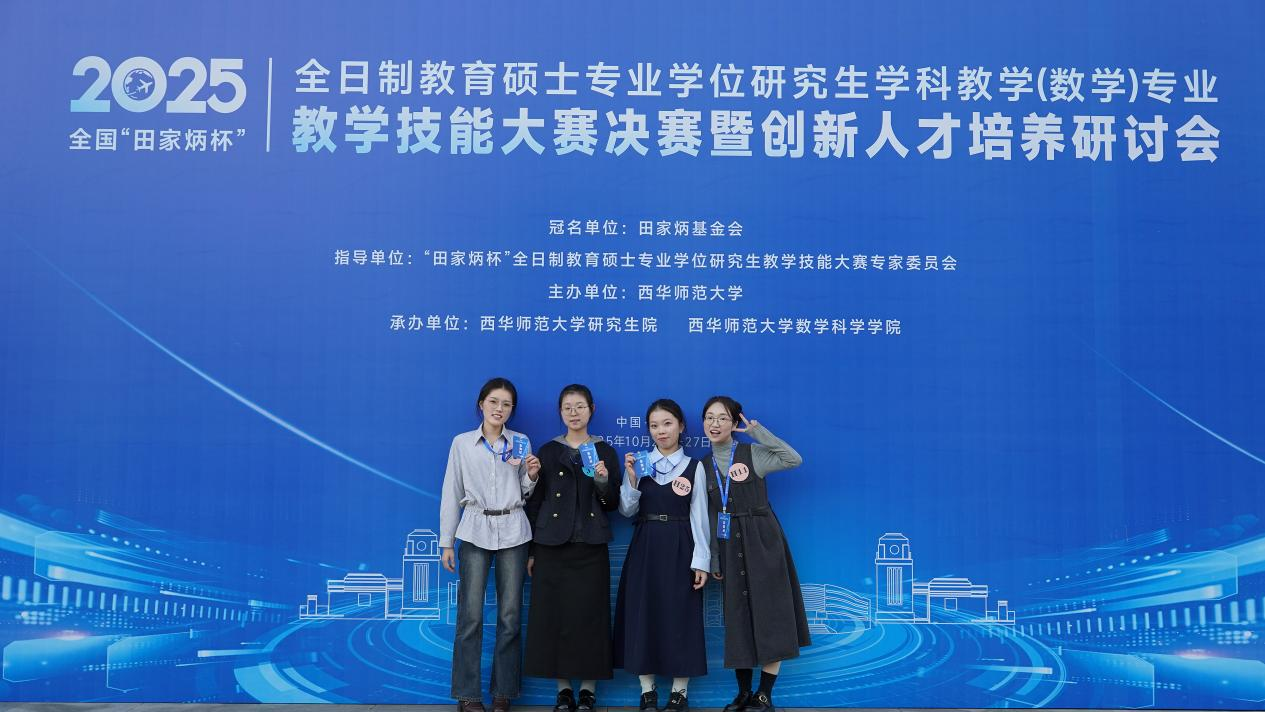 近日,2025年全国“田家炳杯”全日制教育硕士专业学位研究生学科教学(数学)专业教学技能大赛决赛在四川南充举行。我校2024级学科教学(数学)专业硕士研究生梁奕晨同学获得国家二等奖,王思雨、徐春蕊和张晨钰三位同学获优秀教学设计奖。