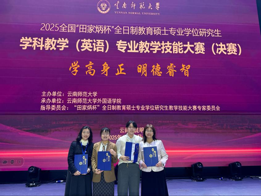 近日,“田家炳杯”全日制教育硕士专业学位研究生学科教学(英语)专业教学技能大赛全国决赛在云南师范大学进行。我校2024级学科教学(英语)专业学生殷嘉怡、王晓凡分别获三等奖。