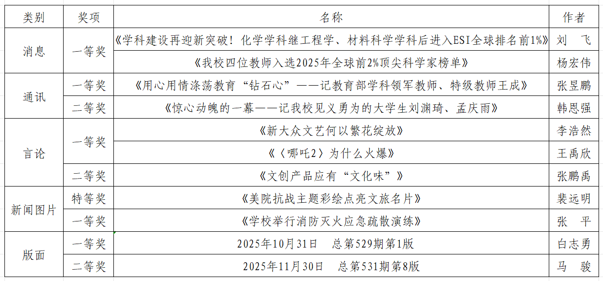 近日,2025年度“陕西高校新闻奖”评选结果揭晓,《宝鸡文理学院报》11件作品获奖,其中,特等奖1项、一等奖7项、二等奖3项。