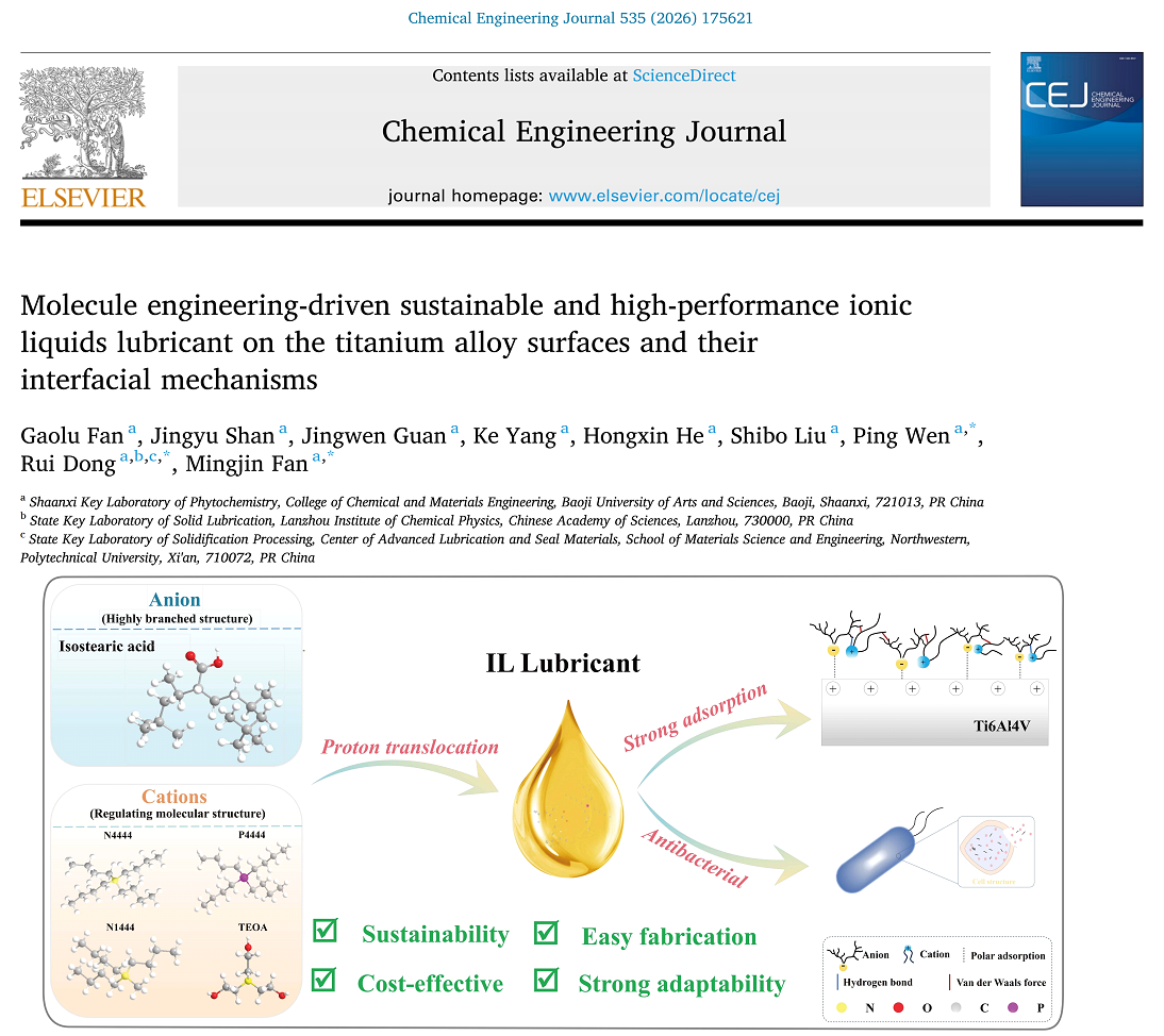 近日,我校化学与材料工程学院2024级物理化学专业硕士研究生樊高璐同学完成了分子工程驱动的高性能离子液体润滑剂的创新设计及作用机制相关研究工作,在国际著名期刊Chemical Engineering Journal上发表题为“Molecule engineering-driven sustainable and high-performance ionic liquids lubricant on the titanium alloy surfaces and their interfacial mechanisms”的研究论文。该期刊为中科院分区SCI1区(TOP期刊),影响因子13.2。论文通讯作者为化学与材料工程学院先进润滑与防护材料研发创新团队凡明锦教授、文平副教授和董瑞副教授,我校为论文第一完成单位和唯一通讯单位。