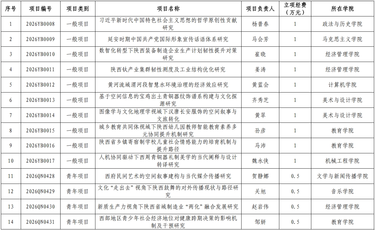 近日,陕西省社会科学界联合会公布了“2026年度陕西省哲学社会科学研究专项一般项目、青年项目”立项结果,我校获批14项,其中一般项目10项、青年项目4项,获批经费共计12万元。(科研管理处 文/张蕴 审核/胡登卫)