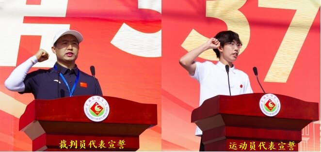 政法与历史学院学生屈子昂、体育学院教师罗光飞分别代表运动员、裁判员宣誓,承诺将以饱满的热情参赛、恪守体育精神,尊重规则、赛出水平;将严格依规执裁,确保赛事公平、公正、有序进行。